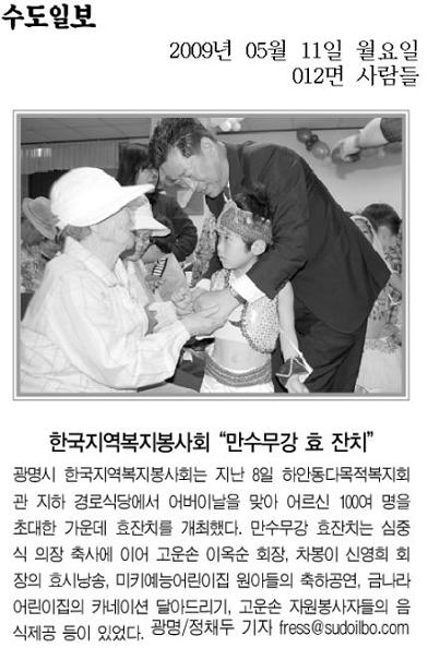 2009어버이날 기념 "만수무강 효잔치" 성료 페이지 정보 작성자 최고관리자 댓글 0건 조회 6,219회 작성일 09-05-11 00:00 본문 2009어버이날 기념 "만수무강 효잔치" 성료 목록 이전글2009 어버이날 기념" 제9회 어버이 효사랑 푸드뱅크 나눔마당" 09.05.11 다음글2009 행복+사랑÷ 바자회 성료 09.04.27