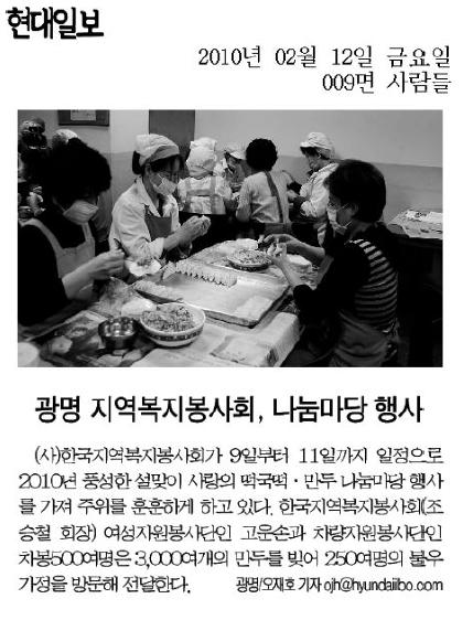 2010년 떡국떡 만두나눔마당 보도자료 페이지 정보 작성자 최고관리자 댓글 0건 조회 8,029회 작성일 10-02-16 00:00 본문 2010년 떡국떡 만두나눔마당 보도자료 목록 이전글제10회 풍성한 한가위 푸드뱅크 나눔마당 소식(광명인터넷방송) 10.10.20 다음글2010년 떡국떡 만두나눔마당 보도자료 10.02.16