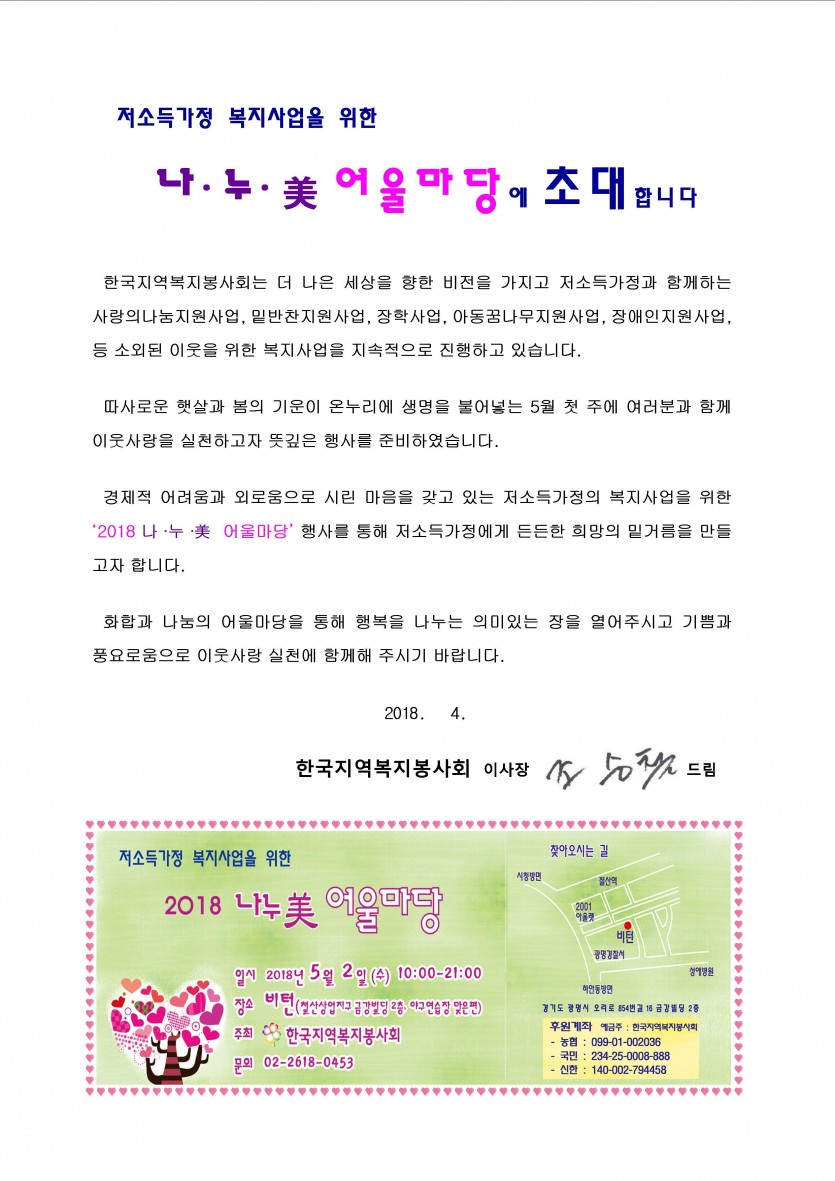 저소득가정 복지사업을 위한 나누미어울마당에 초대합니다 일시: 2018. 5. 2(수) 오전10시~ 오후9시 장소: 비턴(광명시 오리로 854번길 16 금강빌딩 2층)