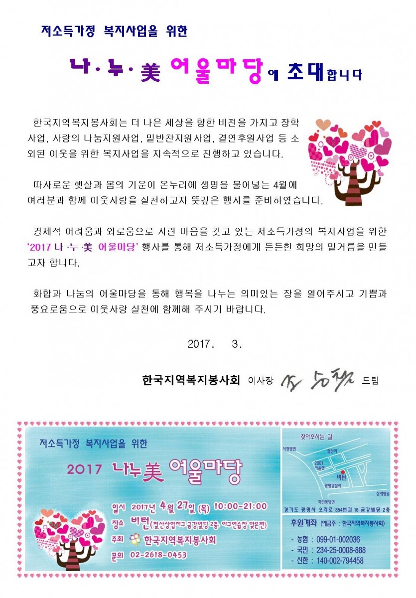 나누미 어울마당에 초대합니다 페이지 정보 작성자 한국지역복지봉사회 댓글 0건 조회 15,173회 작성일 17-03-20 00:00 본문 저소득가정 복지사업을 위한 나누미 어울마당에 함께해주세요^^ 목록 이전글2017년 청소년 자원봉사 현장체험 신청안내 17.07.17 다음글[나눔과꿈] "가족의 재발견" 프로그램 안내 17.03.20